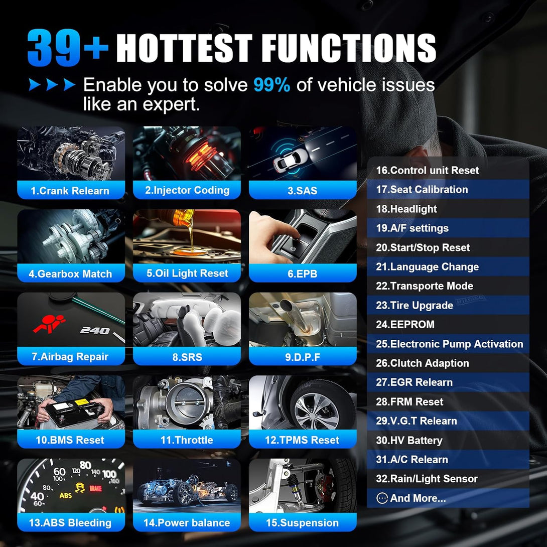 - [𝟑9+ 𝐒𝐩𝐞𝐜𝐢𝐚𝐥 𝐒𝐞𝐫𝐯𝐢𝐜𝐞𝐬 & 𝐂𝐨𝐦𝐩𝐫𝐞𝐡𝐞𝐧𝐬𝐢𝐯𝐞 𝐄𝐂𝐔 𝐂𝐨𝐝𝐢𝐧𝐠 𝐒𝐨𝐥𝐮𝐭𝐢𝐨𝐧𝐬] XTOOL automotive scanner diagnostic tool offers 36 maintenance Resets Adaptations Relearns Calibrations functions like Crank Sensor Relearn, Oil Reset, EPB, SAS, BMS, Throttle, Injector Coding, ABS Bleed, TPMS Reset, Power Balance, it supports online & offline ECU coding for BMW/Benz, and PMI function for Ford, Lincoln, and Mazda. This covers both vehicle performance optimization and module replacement needs for Father, technicians and DIY enthusiasts. 𝐓𝐢𝐩: Compatibility varies by cars, please contact us to check compatibility first.