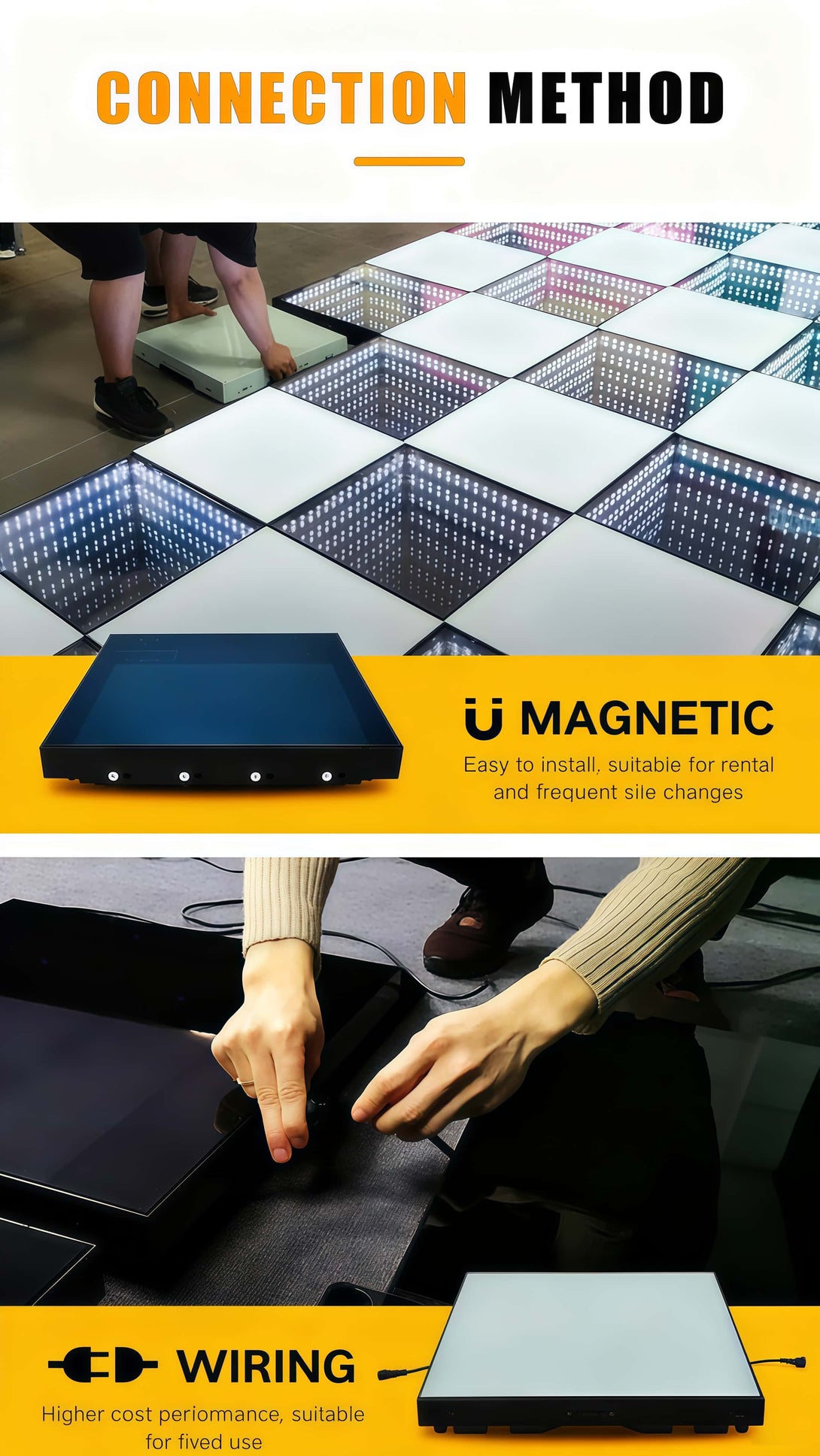 The size of each tile of the magnet model is 50*50*7cm. If you wish to customize the size and area of the floor tile lights according to your venue, please contact our customer service.