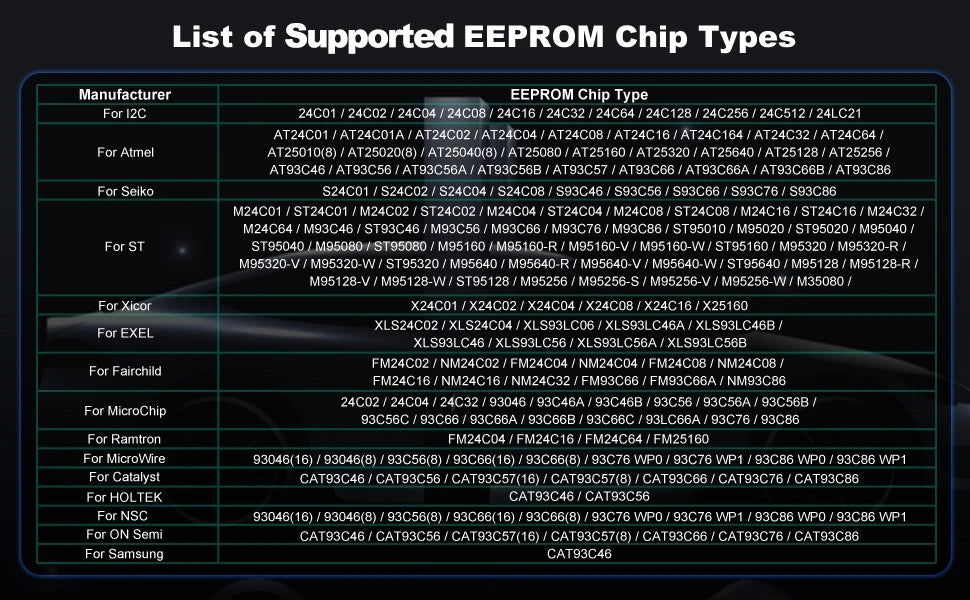 - Equipped with MCU/EEPROM chip reading and writing capabilities, as well as anti-theft module data backup functions. It accurately reads remote control frequencies, chip types, and key IDs.